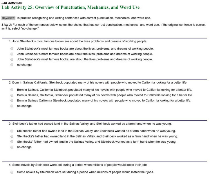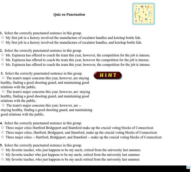 This site offers a 30 question, interactive sentence quiz. Students are asked to read sentences, decide if they are correct as written, and then select a response. Java is required.