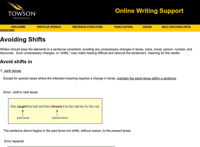 This entry focuses on avoiding shifts when writing sentences including shifts in verb tense, mood, number, person, discourse, and sentence structure. It provides explanation and examples of each type of error and explanation and examples...