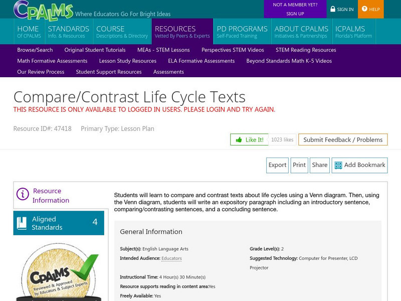 [Free Registration/Login Required] Students will learn to compare and contrast texts about life cycles using a Venn diagram. Then, using the Venn diagram, students will write an expository paragraph including an introductory sentence,...