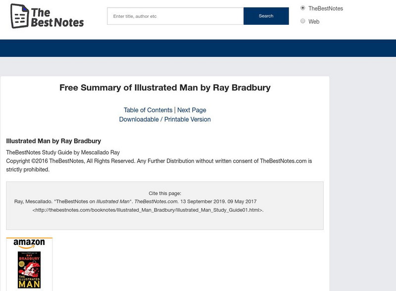 This is a complete online study guide/notes for the short story collection Illustrated Man by Ray Bradbury including author information, literary elements, chapter-by-chapter summaries/notes, study questions, and analysis.