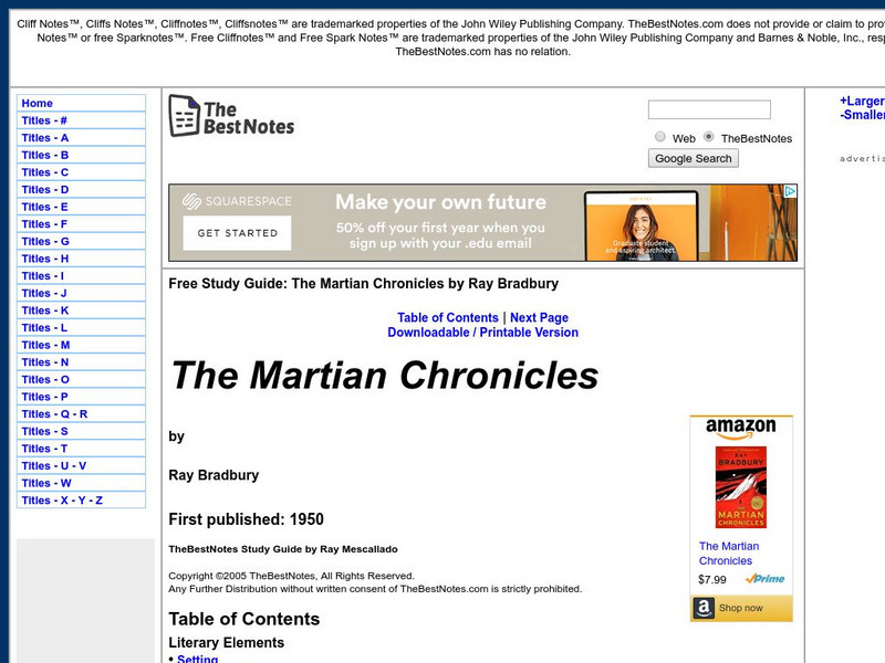 This is a complete online study guide/notes for the short story collection The Martian Chronicles by Ray Bradbury including author information, literary elements, chapter-by-chapter summaries/notes, study questions, and analysis.