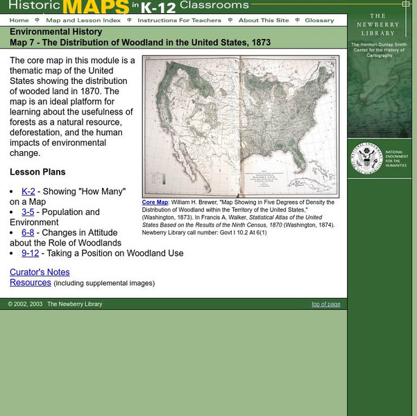 Lesson plans for K-12 using maps that show the distribution of wooded land in 1873. Students examine the impact of humans on the environment.