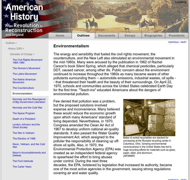 Brief overview of the Environmental Movement and the growing concern about the environment spurred on by the mid 1960s push for civil rights in America.