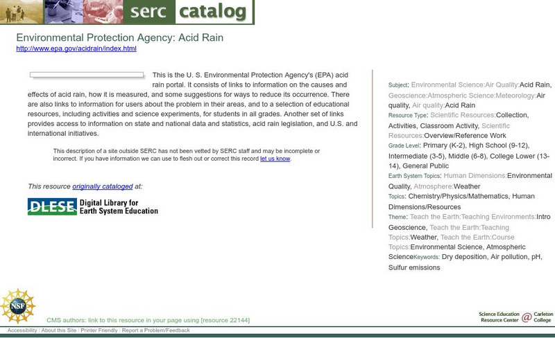 This is the U. S. Environmental Protection Agency's acid rain portal. Find links to information on the causes and effects of acid rain, how it is measured, and some suggestions for ways to reduce its occurrence.