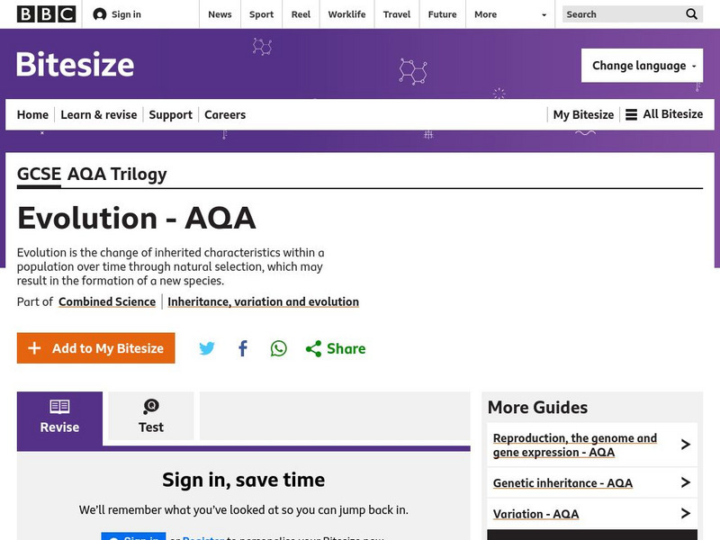[Free Registration/Login may be required to access all resource tools.] This study guide looks at Darwin's theory of evolution and natural selection. It also looks at some of the evidence supporting the theory of evolution (comparative...
