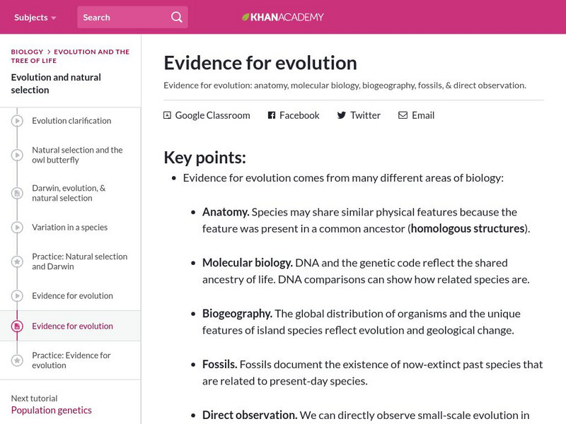 Explore the evidence for evolution: anatomy, molecular biology, biogeography, fossils, & direct observation.
