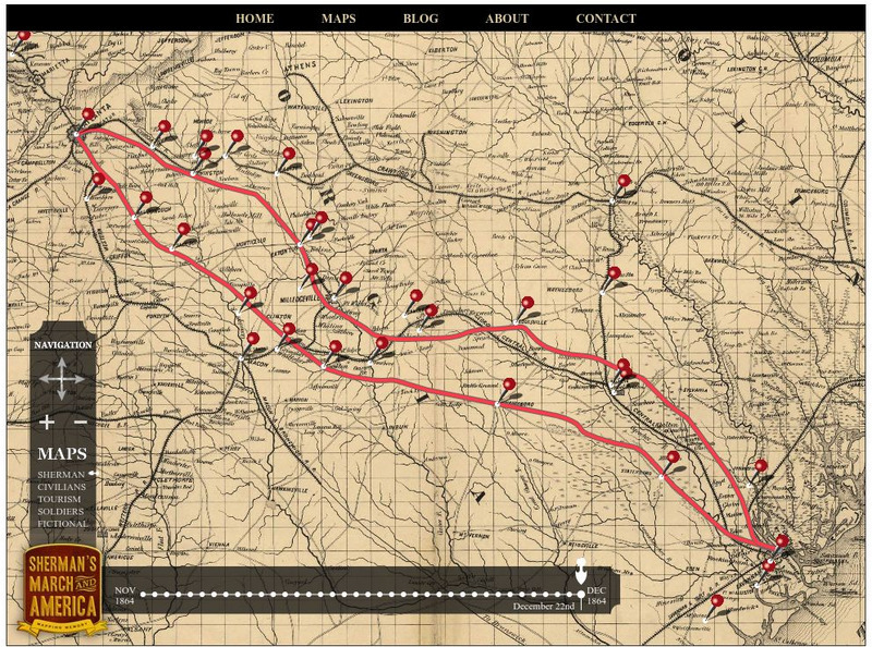 A collection of five interactive maps that each focus on a different perspective of Sherman's March to the Sea. These include a factual map, one that looks at African Americans and Southern civilians, one about travel, one on soldiers,...