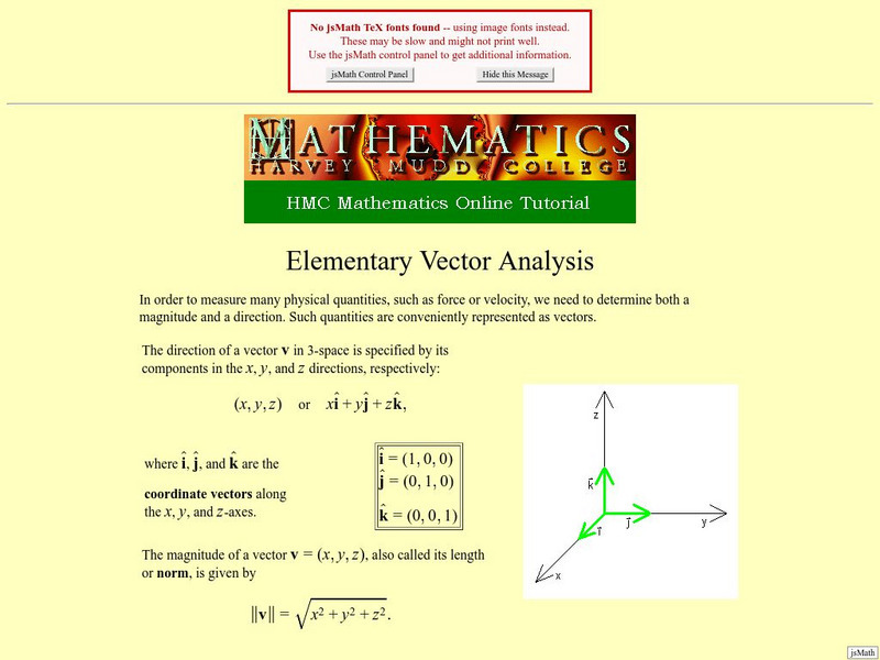 This site from the Harvey Mudd College contains information on vector analysis. The information is very informative, and is mostly wrapped up in formulas and graphs. Definitely factual, a good site to check out.