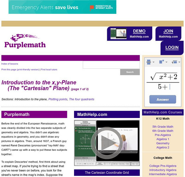Purplemath offers an in-depth lesson on the Cartesian plane. The lesson discusses how to plot points and gives information about the four quadrants. Example problems are given on plotting points and determining the quadrant in which to...