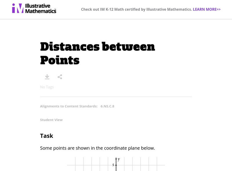 The purpose of this task is for students to find the distance between points that lie in all four quadrants of the coordinate plane. Aligns with 6.NS.C.8.
