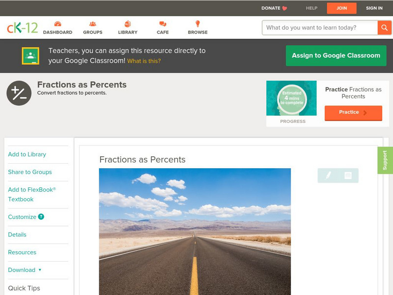 Scroll down to just below the middle of the lesson for an in-depth lesson on converting fractions to percents. Works through numerous examples step by step and shows what happens when the "decimal expansion" doesn't end when converting.