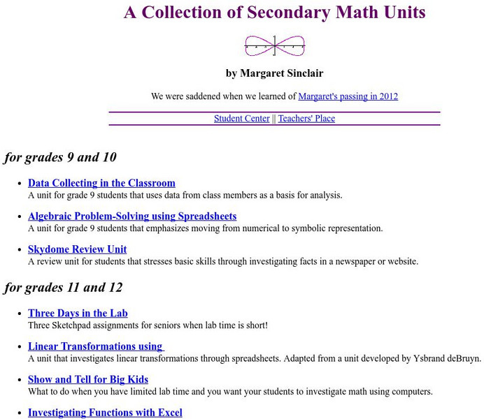 Teachers of grades 9-12 can explore these seven math units for their classes. Data collection and analysis, problem solving with spreadsheets, and linear transformation are just a few of the topics covered here.