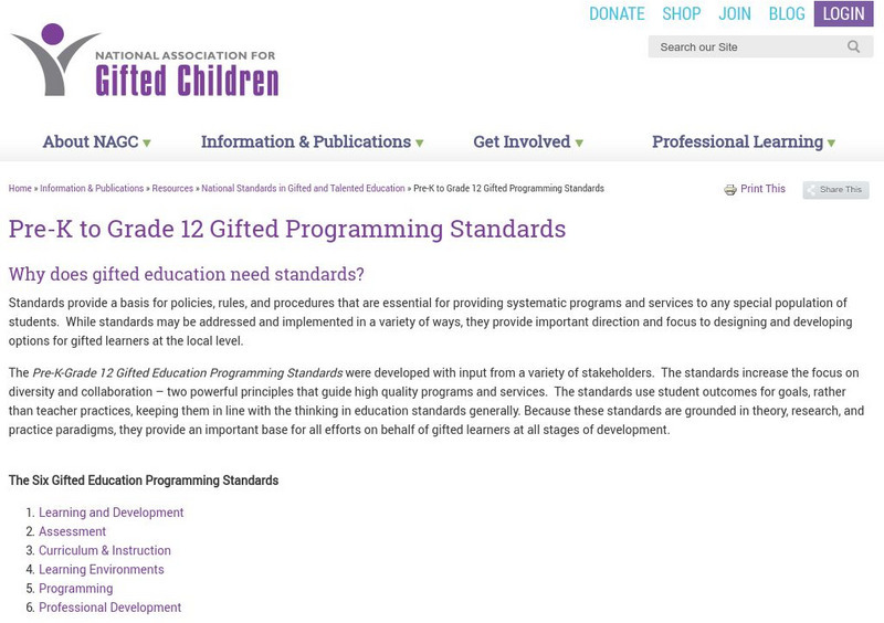 Here are standards "designed to assist school districts in examining the quality of their programming for gifted learners." "Program Design," "Curriculum and Instruction," "Socio-Emotional Guidance and Counseling" and other parts of the...