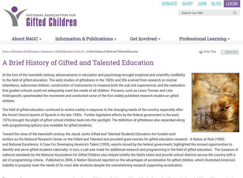 Check out a "Timeline of Key Dates in Gifted and Talented Education," which starts in the late 19th century and provides notes on the development of intelligence testing, the publication of giftedness resources, and the establishment of...