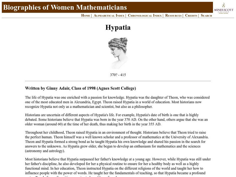 The life and accomplishments of Hypatia-- the Egyptian mathematician, astronomer, and philosopher-- are documented in this synopsis. While the focus is on earlier events in her life, information is also provided on her contributions to...