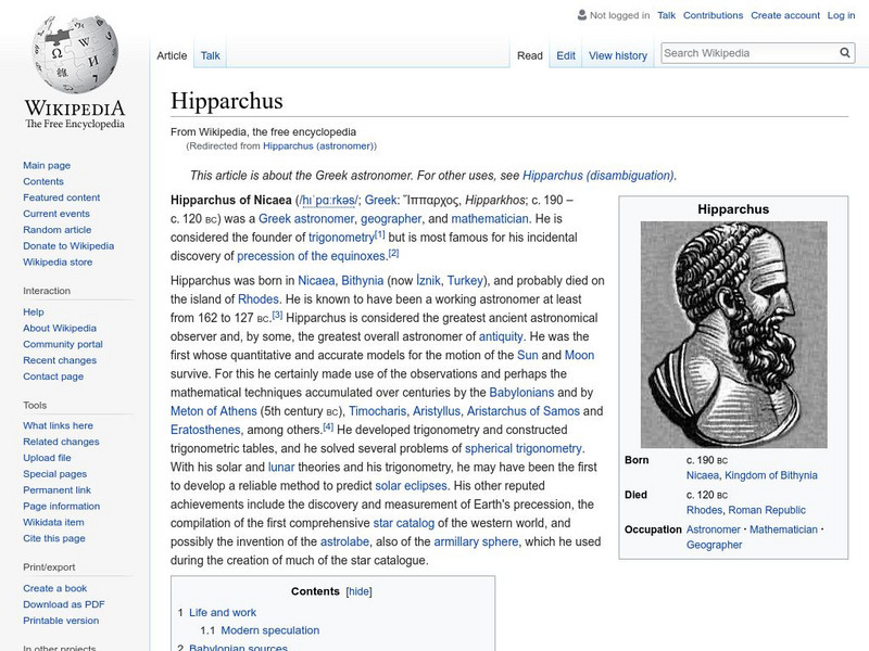 Encyclopedia article about the Greek astronomer Hipparchus that contains information about his life and work. Also includes a lengthy list of references and links to additional information near the bottom of the page.