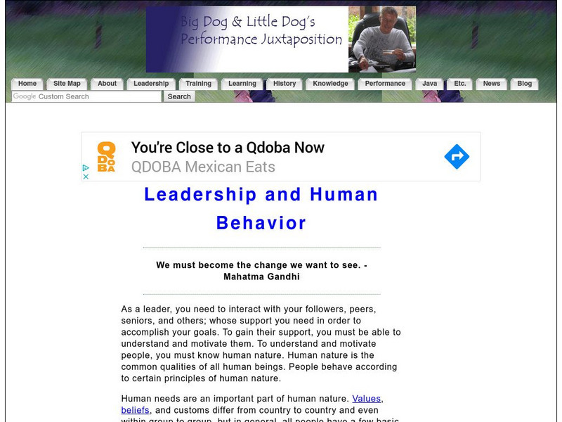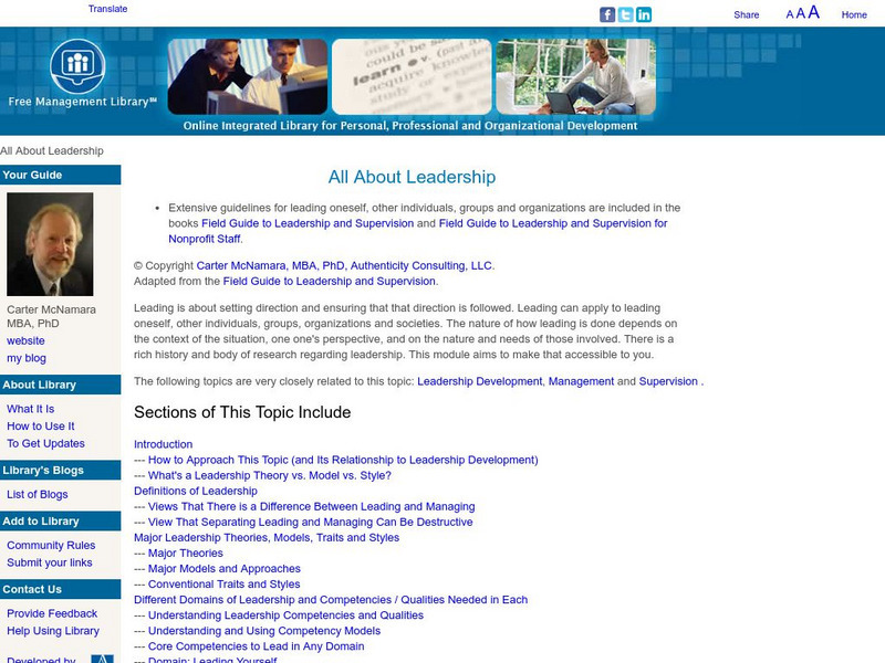 This site includes a vast amount of information regarding leadership. Topics include leadership styles, theories, and trends. Consists of a large number of links that allow for easy access to distinct topics.
