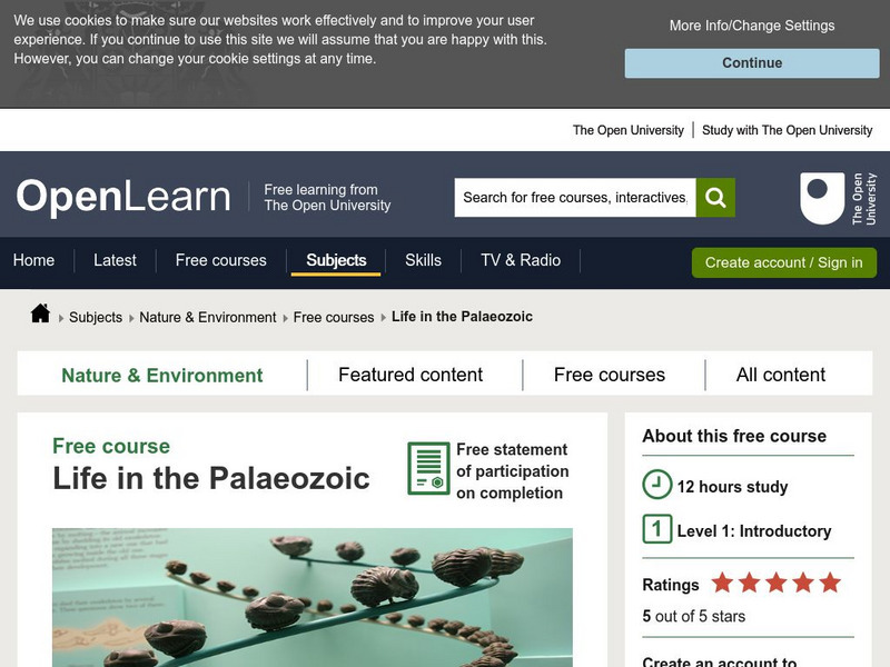 This resource introduces students to the Palaeozoic Era. Some topics examined are the Cambrian explosion, Ordovician seas, Silurian Period, and the vertebrate evolution. The activity includes a unit outline, online forum, and a learning...