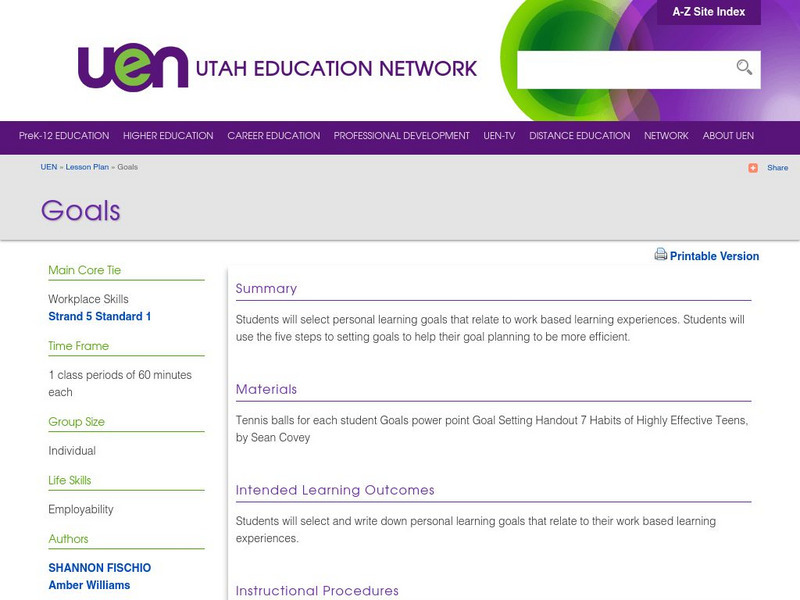 As a response to 7 Habits of Highly Effective Teens by Sean Covey, students will select and write down personal learning goals that relate to their work based learning experiences. Several reproducible sheets related to goal setting are...