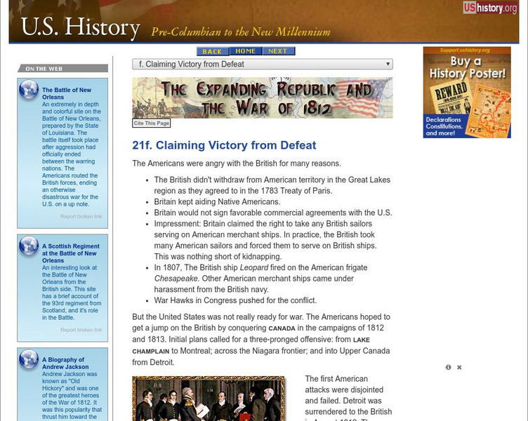 A list of the reasons for the War of 1812 is followed by an overview of the important battles of the war and the terms of the treaty that ended it.