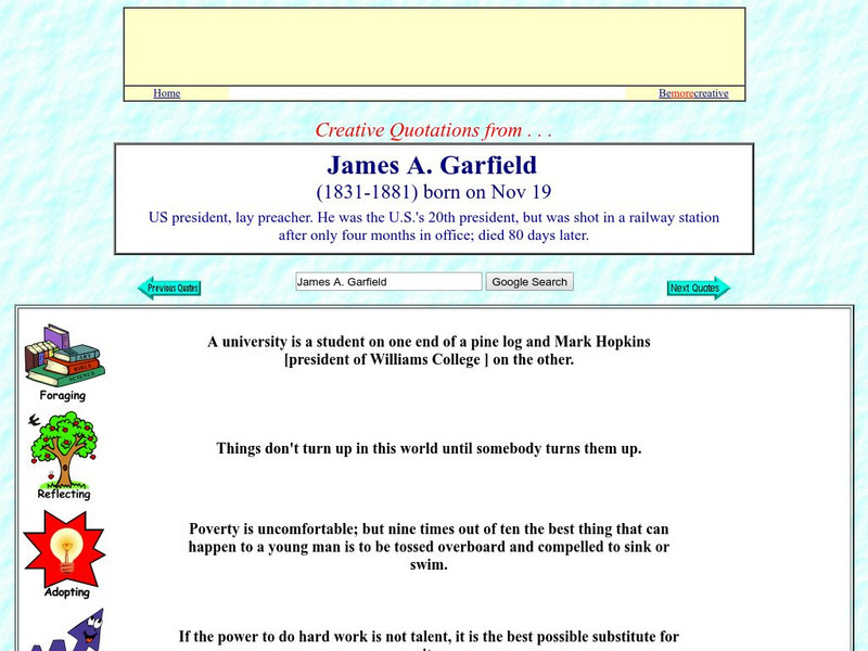 This site from Creative Quotations contains a listing of quotations by James Garfield, the 20th President of the United States. A brief biographical sketch of Garfield is also provided.