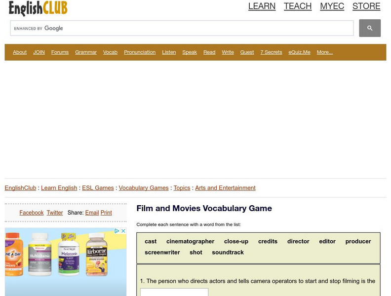 Choose from a word bank to complete ten sentences about terms used in film making. Hints are available if needed, and a percentage score is displayed once answers are submitted.