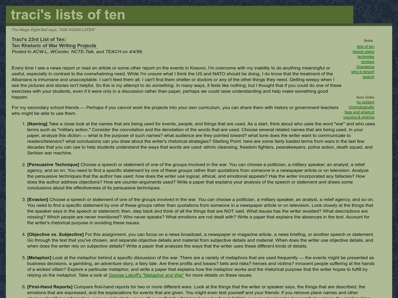 Created by a teacher responding to the events in Kosovo, this list is a great start for a media literacy class project. Good discussion-starting questions are included with each item on the list. Requires some independent research to...