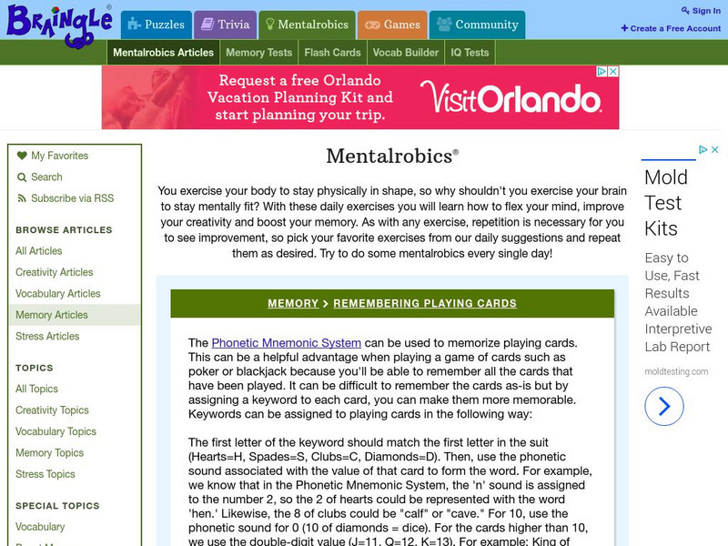 Prepare for tests and exams by using the memorization techniques described at this website. Learn about the "story system," the "link system," the "keyword-mnemonic technique," and other ways all students can improve their memory skills.