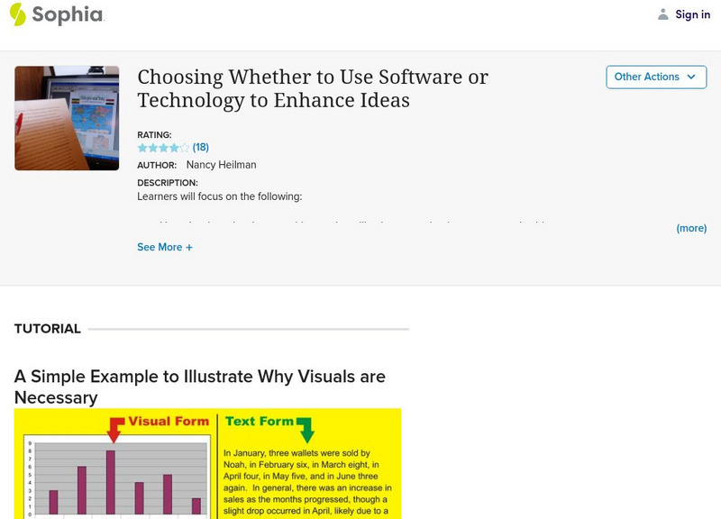 A tutorial explaining how to use technology to create graphics and visuals to enhance documents and presentations. A brief audiovisual presentation identifies types of visuals, and another audiovisual presentation describes how and when...