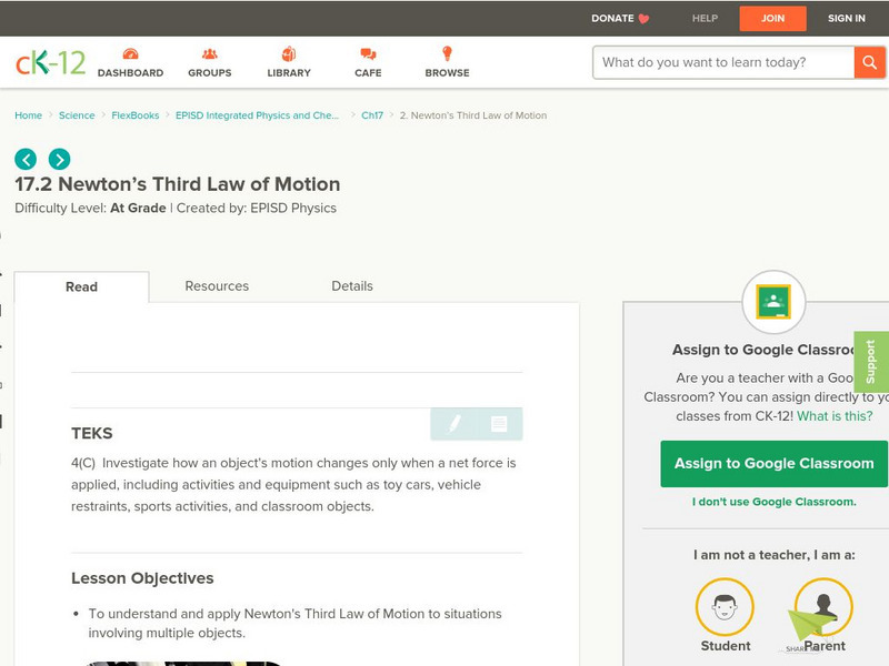 [Free Registration/Login may be required to access all resource tools.] Students find out about Newton's Third Law of Motion, and explore situations involving multiple objects.