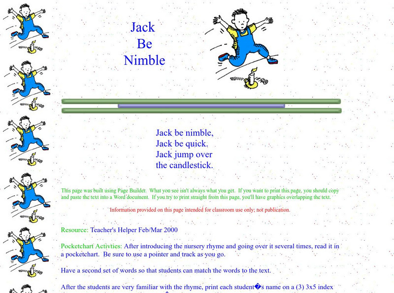 Using the "Jack Be Nimble," nursery rhyme, teachers are given a variety of cross-curricular ideas to make the nursery rhyme come alive for the students.