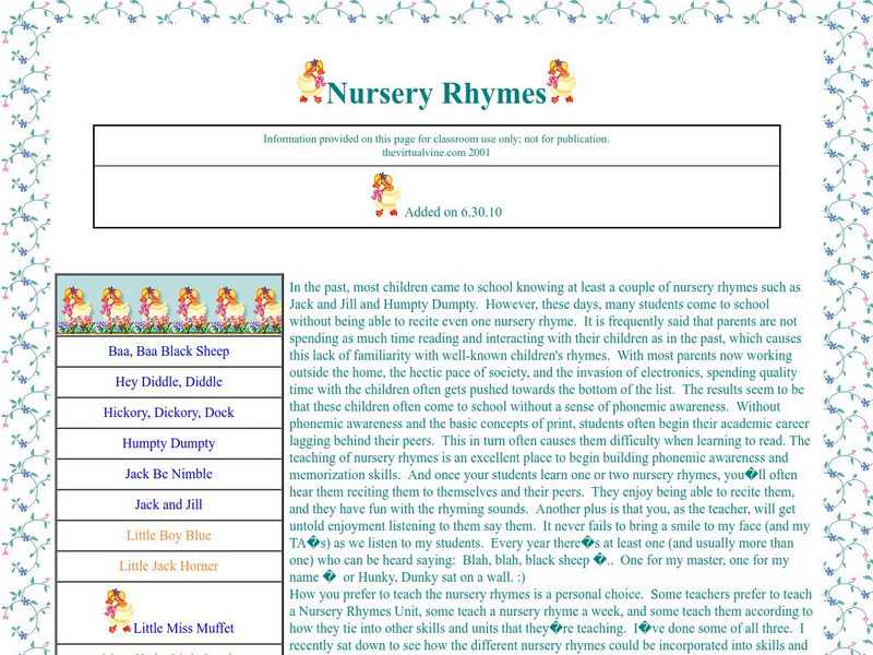 An outstanding resource to get all your favorite Mother Goose nursery rhymes. Activities included are suggestions on reading and teaching nursery rhymes to children at varying ages. Has a list of recommended resources that go along with...