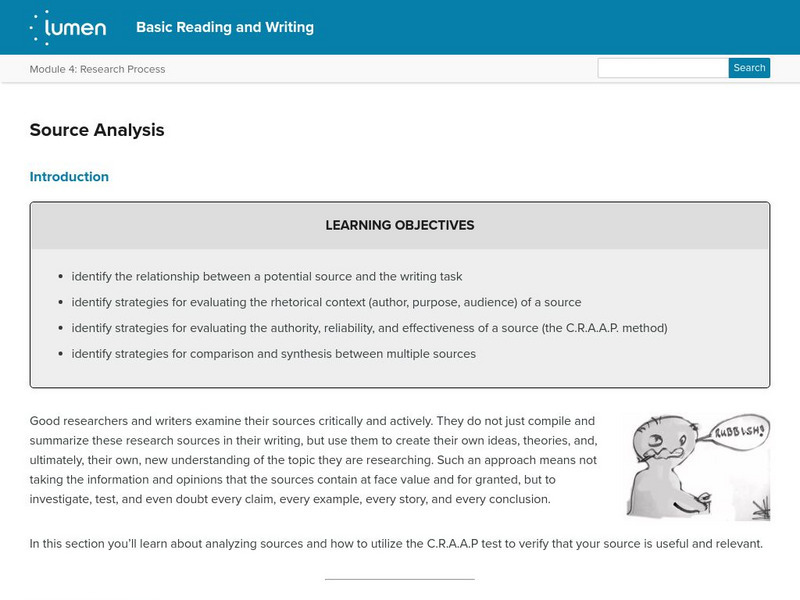 This instructional activity focuses on how to analyze sources using the C.R.A.A.P. method, how to integrate sources into your paper, and how to synthesize information from multiple sources. It provides three videos: "Researching 101:...