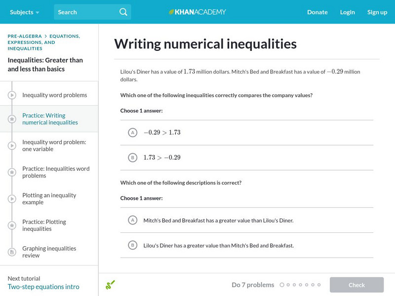 Practice writing inequalities to describe real-world situations. Students receive immediate feedback and have the opportunity to try questions repeatedly, watch a video or receive hints.