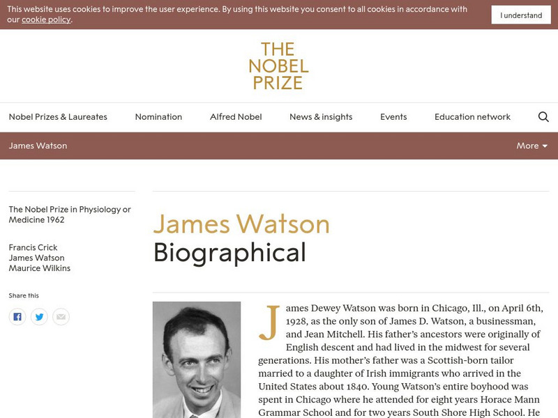 A biography of James Dewey Watson who, along with Francis Crick, discovered the structure of DNA. They were awarded the Nobel Prize for Physiology and Medicine in 1962. Watson was later the first person to lead the Human Genome Project....