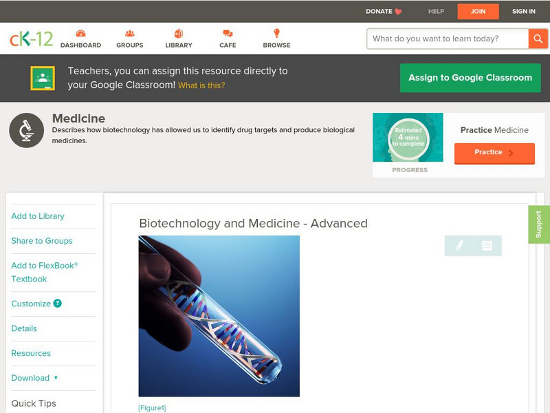 [Free Registration/Login may be required to access all resource tools.] Informational text and video clips about biotechnology and medicine. After reading the text, review the key vocabulary terms and answer review questions.