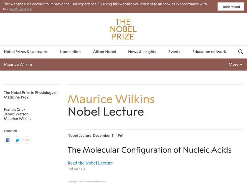 Download and read Maurice Wilkins Nobel Lecture "The molecular configuration of nucleic acids." This lecture, originally given December 11, 1961, is available in pdf format.
