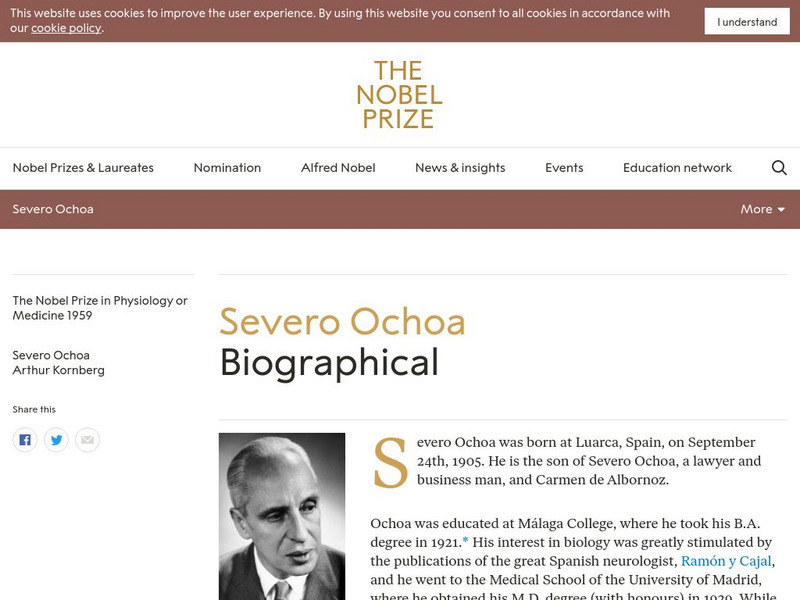 Read about the 1959 co-recipient of the Nobel Prize in Physiology -- Severo Ochoa -- who contributed to the "discovery of the mechanisms in the biological synthesis of ribonucleic acid and deoxyribobucleic acid."