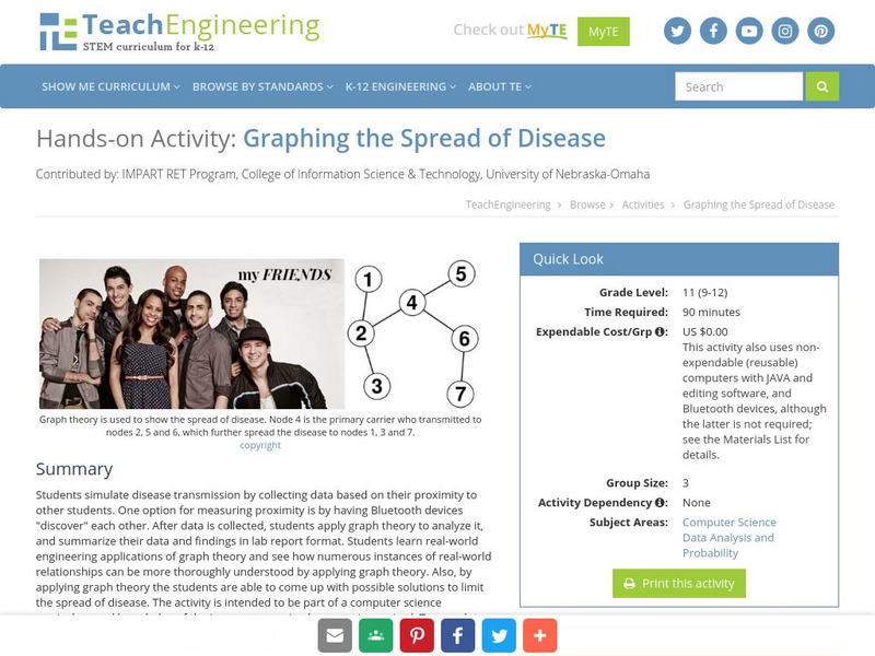 Students simulate disease transmission by collecting data based on their proximity to other students. One option for measuring proximity is by having Bluetooth devices "discover" each other. After data is collected, students apply graph...