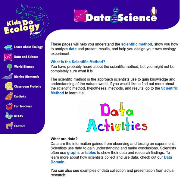 A collection of worksheets that focus on data analysis and organizing data. Includes detailed examples, colorful visuals, and a link to a related game. Acrobat Reader required.