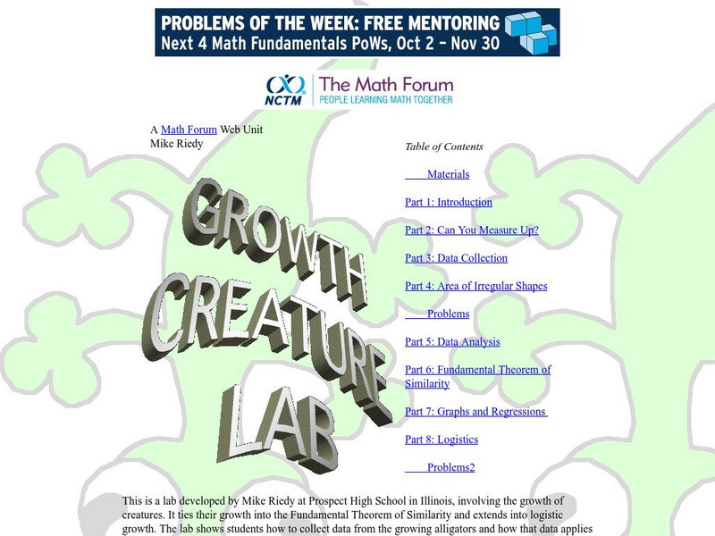 Lesson plan completely explains how students will collect data on the growth of an "alligator" and determine the relationship of the growth data to the Fundamental Theorem of Similarity and to topics in geometry in general. All of the...