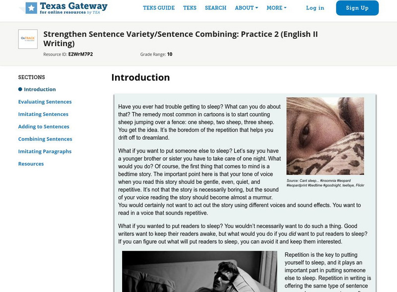 [Accessible by TX Educators. Free Registration/Login Required] In this lesson, you are going to practice recognizing sentences that need to be revised to add variety and revising sentences by using additions and sentence combining.