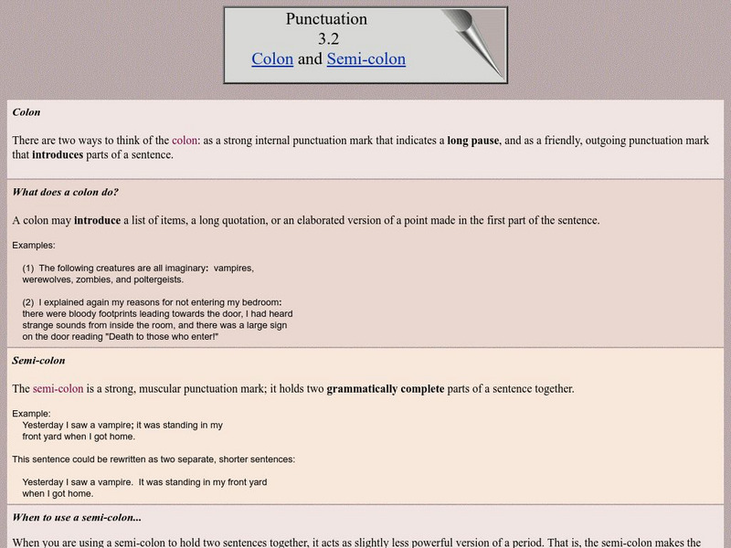 The first part of this site provides information and examples for the correct usage of the colon and the semicolon. The second part is an exercise. Click on "semi-colon" of "colon" to correctly punctuate the sentence. Then click on...