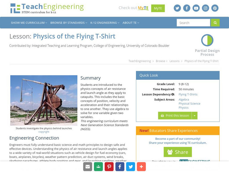 Students are introduced to the physics concepts of air resistance and launch angle as they apply to catapults. This includes the basic concepts of position, velocity and acceleration and their relationships to one another. They use...