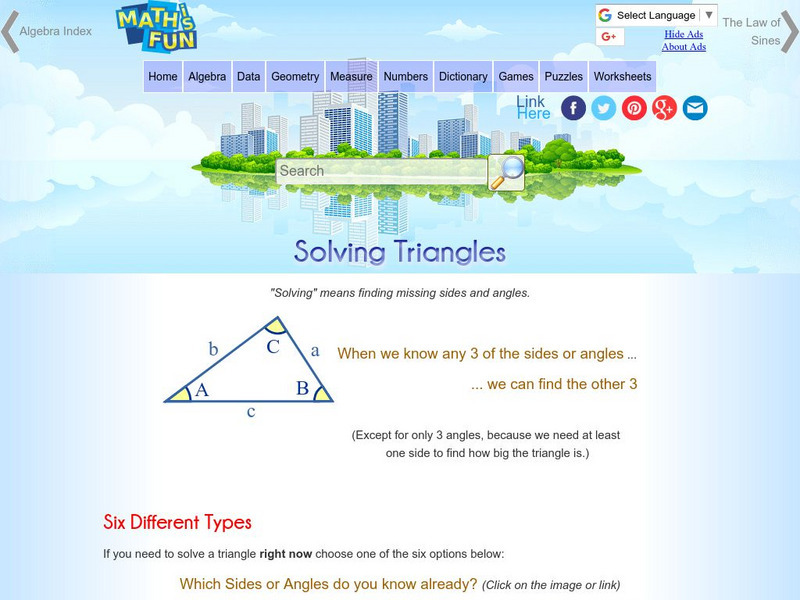 Find guidelines to help you "solve" triangles, which means finding the value of missing sides and angles. Provided are examples of six scenarios in which you can solve a triangle's missing measurements, as well as relevant equations,...