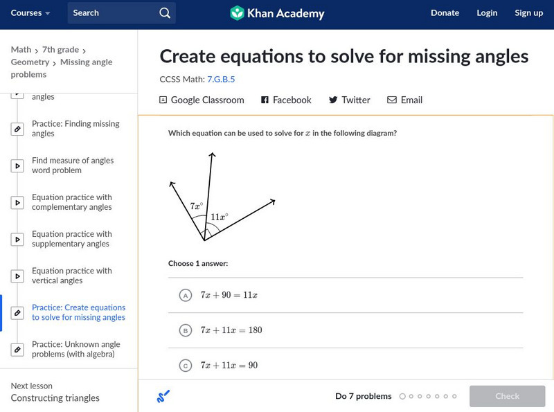Use understanding of vertical, complementary, and supplementary angles to set up an appropriate equation to solve for a missing angle measure. Students receive immediate feedback and have the opportunity to try questions repeatedly,...