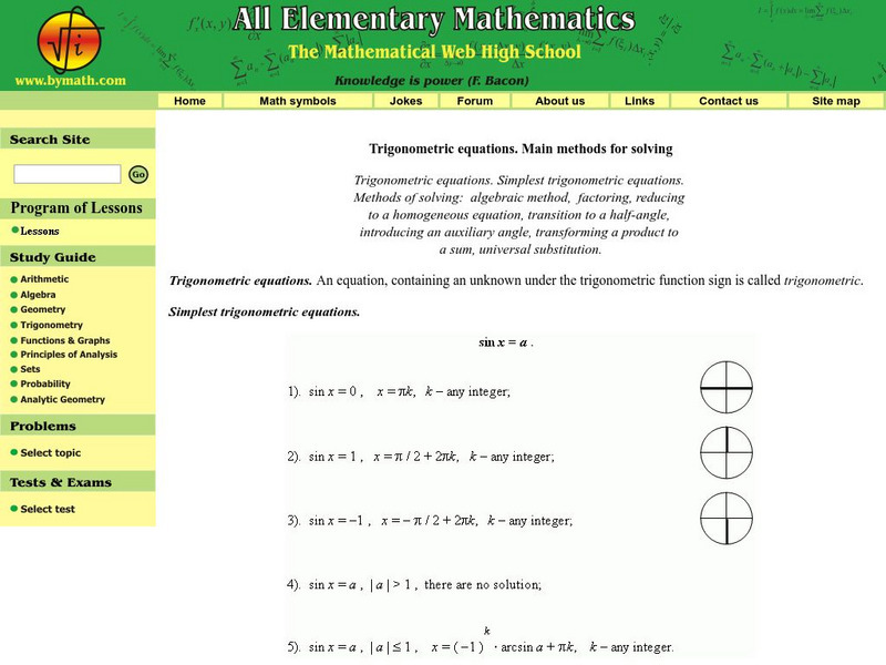 This site gives a definition for what a trigonometric equation is, gives a listing of the simplest trigonometric equations, and lists seven main methods of solution of trigonometric equations with examples.