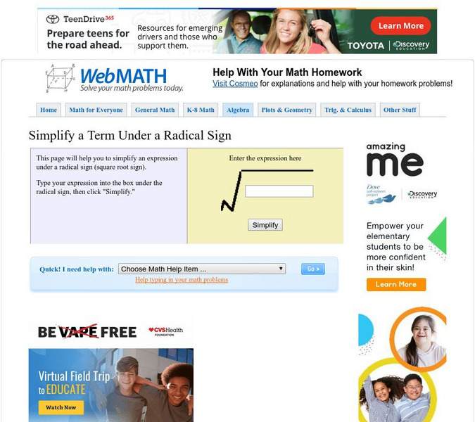 Discovery Education: Web Math: Simplify a Term Under a Radical Sign