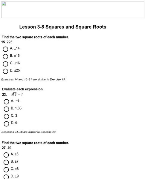 Use Glencoe's Math Course 3 randomly generated self-checking quiz to test your knowledge of square roots. Each question has a "Hint" link to help. Choose the correct answer for each problem. At the bottom of the page click the "Check It"...