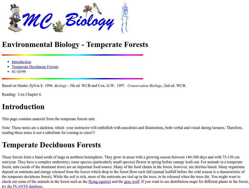 The first section in this site from Marietta College introduces you to the temperate forest. It also discusses the locations of these forests and the animals that live there. Links to related sites are provided.